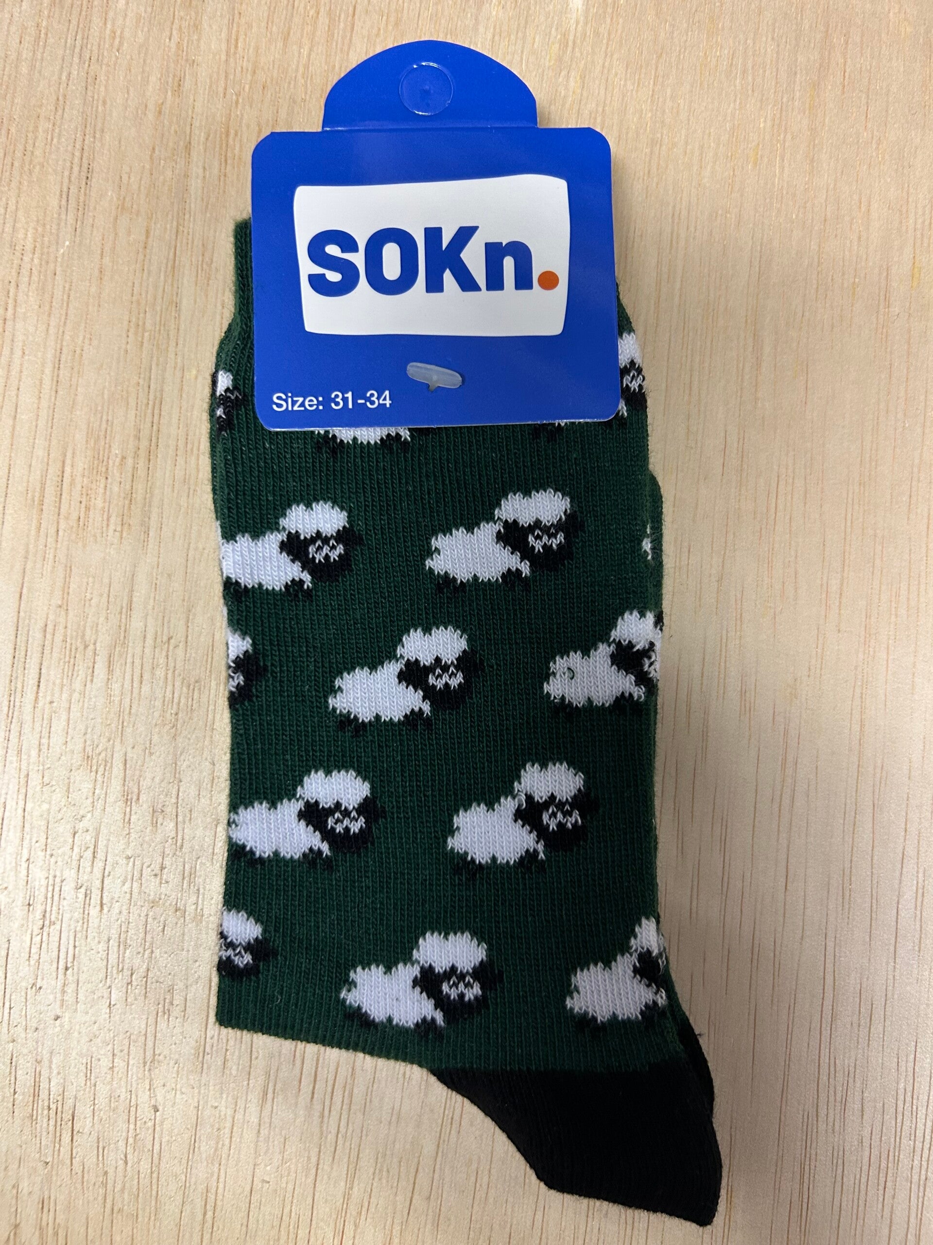 Kleur: groene sok, zwarte hak en teen. Boord is groen.Schapen zijn zwart/wit.